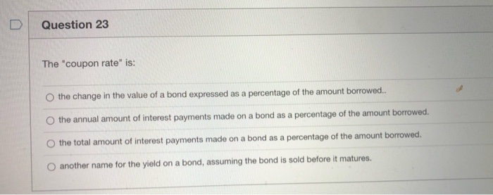 The coupon rate is another name for the - Examveda Examveda The coupon rate is another name for the__________. A. market interest rate B. current yield C. stated interest rate D. yield to maturity Answer: Option C Solution (By Examveda Team) Coupon rate is the rate of interest paid by bond issuers on the bond's face value. It is the periodic rate of interest paid by bond issuers to its purchasers.