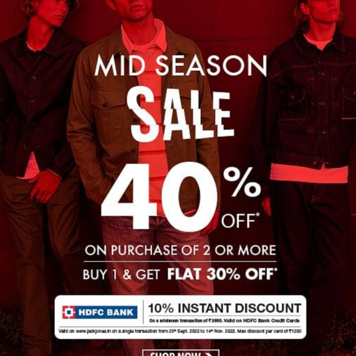 Jack & Jones Coupons: Get 50% OFF Promo Code Nov 2022 Jack & Jones Coupon Code: Buy 4 & Get Extra 10% OFF + Rs.50 OFF on Prepaid Orders expired 3 months ago SUPER10 Jack & Jones Coupon Code: Get Flat 50% Discount on Order Above Rs.5,000 expired 5 months ago JJ50 Jack & Jones Coupon Code: Get Flat Rs.500 OFF on Minimum Order Above Rs.3,000 expired a year ago NOV500 Last Updated: 24-11-2022
